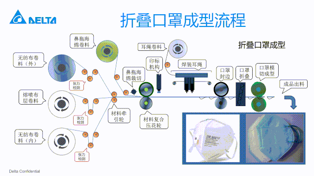 当原材料、加工机械、自动化设备一应齐备,世界工厂的惊人产能在三个月内扭转乾坤。这就是完整产业链的力量! 在这一波复工自救的产业大潮中,台达作为工业自动化及智能制造解决方案的提供商,也迅速调动公司核心技术能力,快速研究各式口罩机的技术特点。在华南、江浙等区域,台达以自身的口罩机解决方案和快速的供应保障能力,协助众多全自动化口罩设备生产企业成功量产,同时还以自身精湛的行业经验,帮助不少制造企业顺利转型,响应疫情防护的需求。全自动口罩折叠机是口罩生产最常见的设备,可以生产各种无呼吸阀、有呼吸阀口罩,能够自动完成从原材料到成品的生产过程。